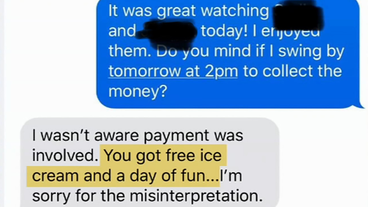 The mother replied by saying she wasn't aware that payment was involved, and that the babysitter got free ice cream and a day of fun. She then apologized for any misinterpretation.