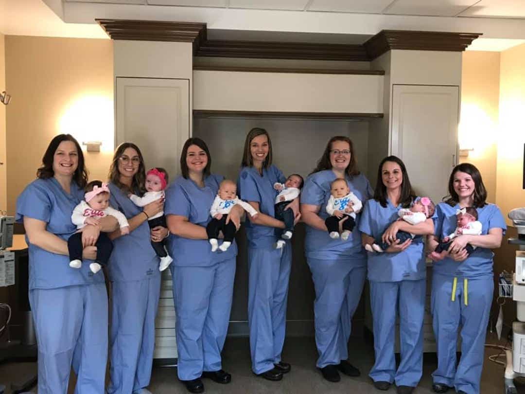 The nurses, Susan, Britaney, Ashley, Sara, Rebecca, Gwen, Michele and OB tech Stavania were all due within in four months of each other. The last baby was born in December.